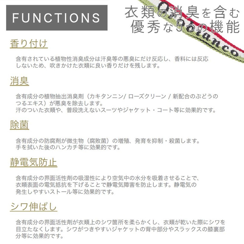 arantyo-ne Arancione ~ by steam distillation from sitorasuhuro-raru Note – daidai (Bitter Orange) Flower gained, neroli, and essential oils. Heart The establishment and warm scent is relaxing and brightening the emotions, feelings, stress, and stabilises the it to be sure. < a > from the fresh top notes of lemon and bergamot fragrance, fresh neroli and sitorasuhuro-raru build a soft and elegant orange flower fragrance. Rust is a warm scent of musk and uxtudyianba-. Italian bergamot oil, lemon oil. With 5 functions, including clothes, deodorant and fragrance free. Do not plant deodorising ingredients is not responding to the smell of sweat, leaving only the free fragrance, spritz, you can simply a good fragrance. The deodorising ingredients of plant extracts, deodorising agent (vegetable oysters/Rose/New Formula Of Grape Vine Extract) to remove odours in the clean. Perspiration on your clothes, perfect for suits, jackets, coats etc. Not effective. · DISINFECTING ingredients of preservatives in the growth, rot fungi), Growth, Development and fungi, bacteria. It is a handkerchief and effective. Anti-static ingredients wicking the moisture of the air in the suction the surfactant to lower the electrical resistance of the garments surface and prevent static electricity. Static prone to stall and effective. Wrinkle and surfactants and ingredients makes your clothes on wrinkle areas Soft and clothes dry when the it crowd. Wrinkle Prone to knee, back part of the back part of the jacket or slacks, and more. Use < > Spray Use, approx. 1,300 times spray. [HOW TO USE] when using: Cloth Product is 20 ~ 32.8 yard away spray to spray water. Curtain Wall or for large area, approximately 54.7 yard away from object and spray evenly. Spray dry well after use. Space for that allows you to spray more than 98.4 foot away from the wall or ceiling. < > Use for everyday cleaning to suit, smooth out wrinkles, and more. - Hand Care After wipe the handkerchief. The Business Trip Or Travel Wash Garment Care. Clothes nioikea after tobacco. Business and now, with a refreshing scent to. Sticks on the other. Gift for your loved ones.