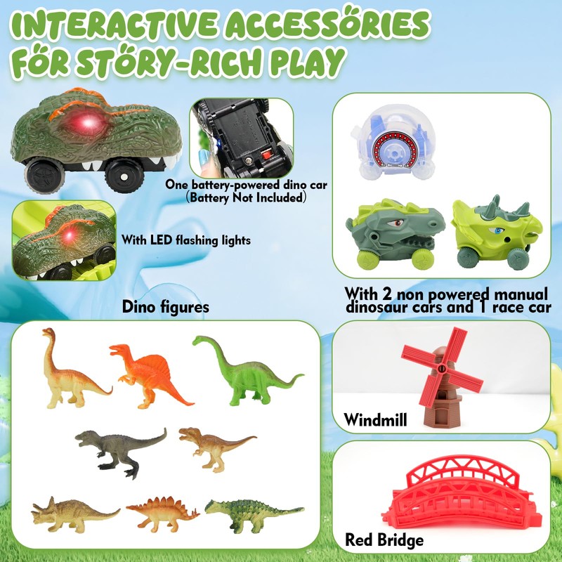 - Interactive Accessories & Dinosaur World Play Mat: The race track set features lifelike dinosaur figures a spinning windmill, red bridge and jungle trees to enrich your adventure scene and keep kids engaged for hours.Complete with a colorful non-woven map featuring prehistoric scenery—perfect for immersive storytelling and role play.