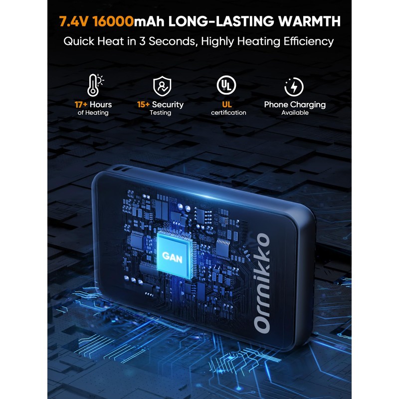 - What You Get: One ORRNIKKO heated vest for women in a carrying bag, one detachable hood, one laundry bag, one 7.4v 16000mAh battery pack with a micro USB cable