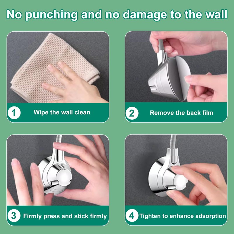 • Easy installation: All you need to do is tear off the film, stick the base to the wall, press the base several times and turn the button on the base clockwise. Wait 3-5 hours for the glue to fully cure, and then hang your hand shower.