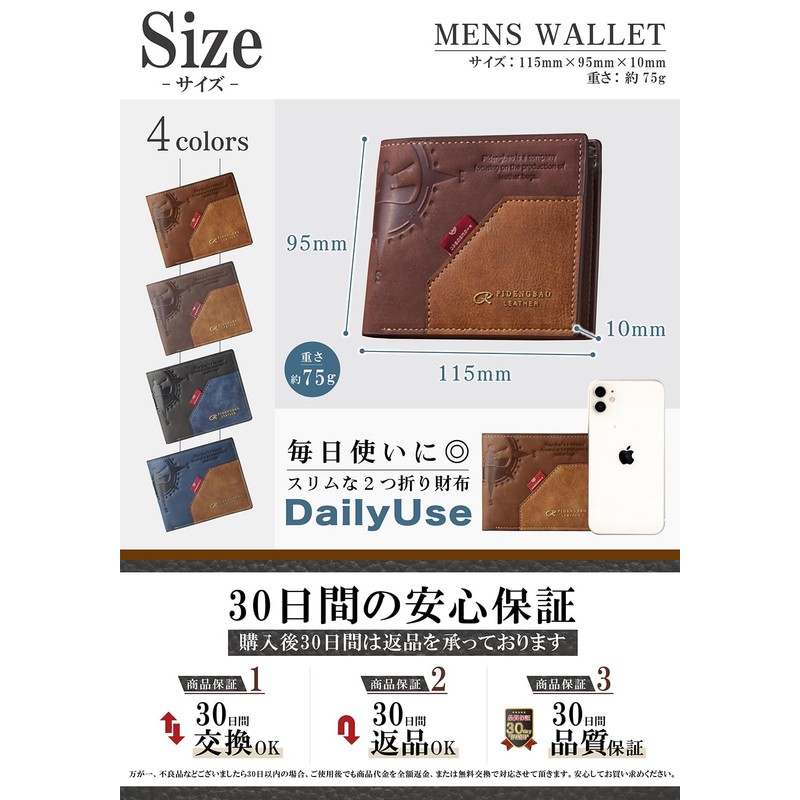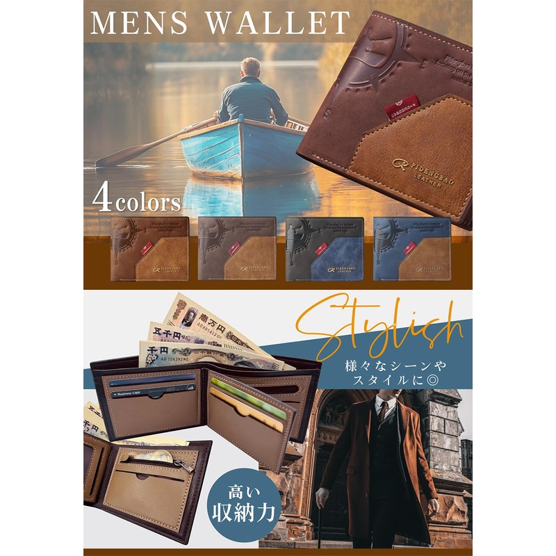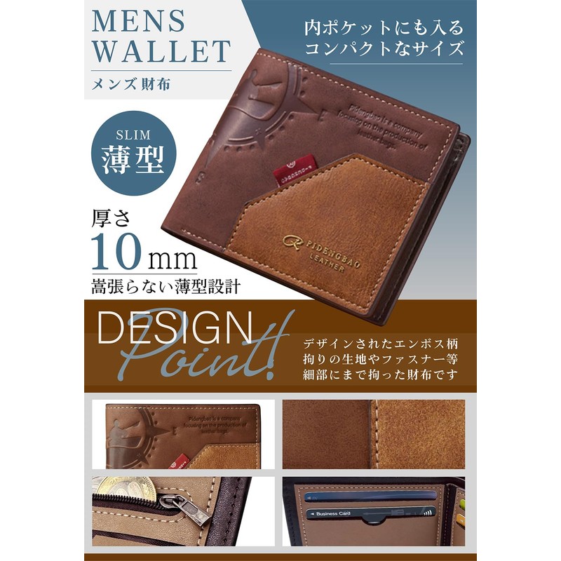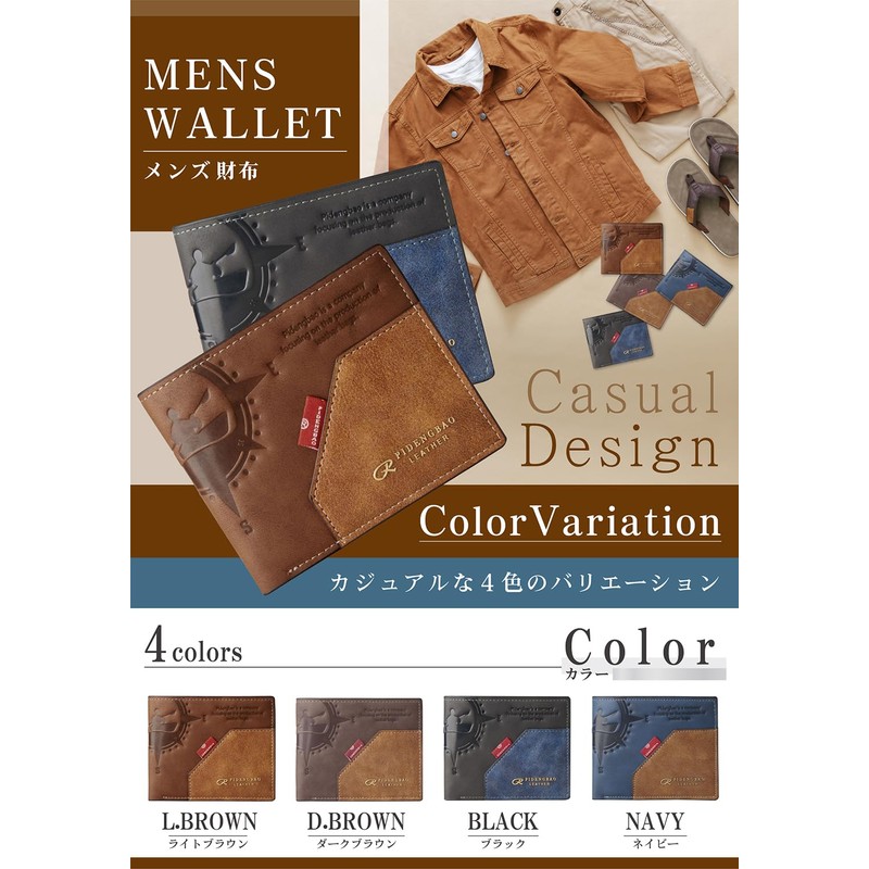 This stylish men's wallet features a bi-fold type that allows you to easily store bills and has high storage capacity even in a slim BODY. Available in 4 fashionable and cool colors. Light brown, dark brown, black, navy, all colors are refined and elegant. Compact yet large capacity, it can store 5 or more cards, and it also includes a coin purse and ID window, so you can have everything you need. Size: 4.5 x 3.7 x 0.4 inches (11.5 x 9.5 x 1 cm); Weight: Approx. 2.6 oz (75 g); Lightweight and thin design makes it easy to carry. It fits in your pocket, making it perfect for personal use, as well as as as a gift. The ID window is also large enough to store your routines and IDs. Designed with embossed fabric and detailed design that can be used for daily use, as well as for travel and school needs.