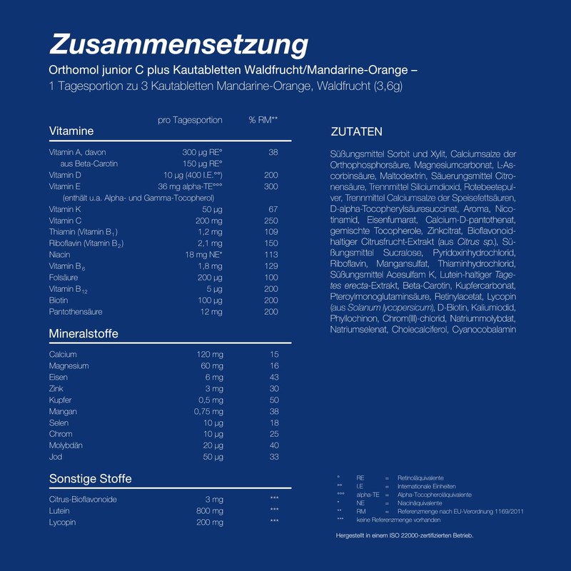 - A valuable contribution to strengthening the child's immune system - made easy with Orthomol Junior C plus: the chewable tablets contain important micronutrients, secondary plant substances and vitamins