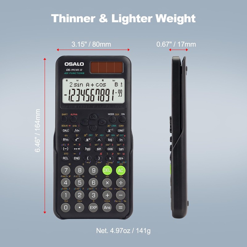 - 【401 Functions Scientific Calculator】With 401 functions for fractions, matrix calculations, statistics, calculus, complex number calculations, equation calculation, standard deviation, vector calculation, permutations and combinations, solar scientific calculator covers most of the scientific functions that students from middle school through college will need to use in their courses and on exams. Reading instruction attached will help you know how to use and find these functions.