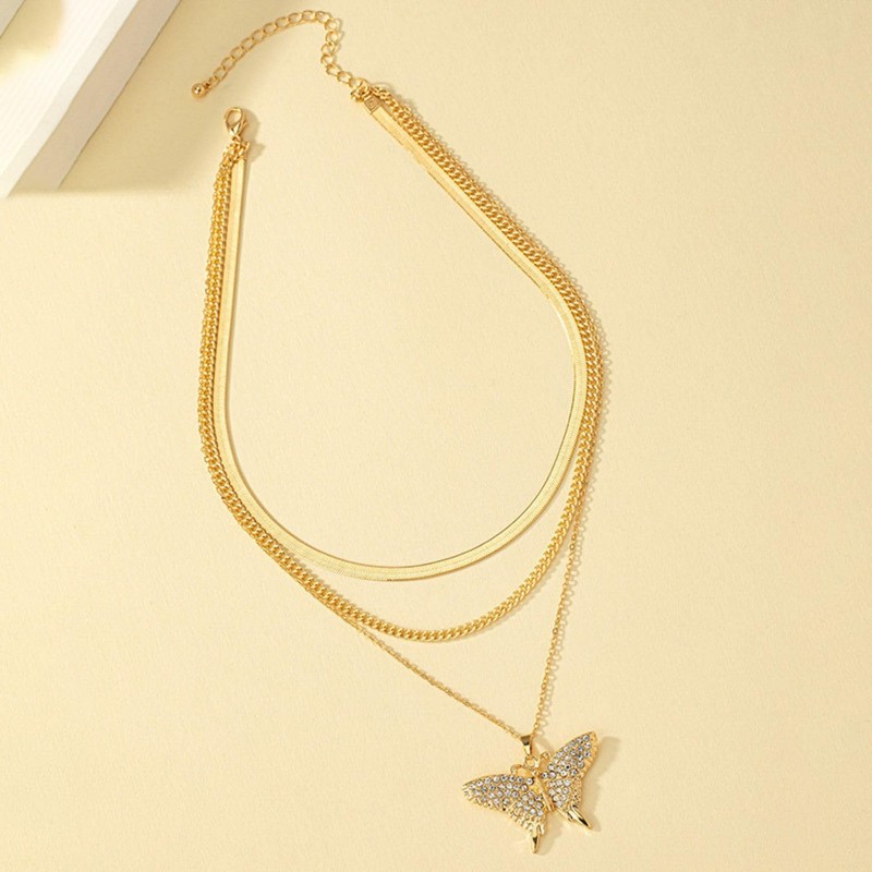 OSCCI Herringbone Butterfly Layered Necklace for Women Gold Plated Chunky Crystal Pendant Snake Chain Necklace (Butterfly)