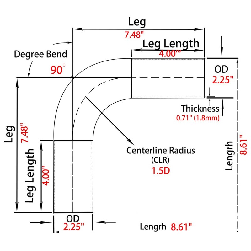 - PRODUCT SIZE: 90 Degree aluminum tube, Outside Diameter: OD 2.25" (57mm), Leg Length: 4" (102mm), Wall thickness: 0.071' (1.8mm), Length: 8.61' (218.6mm), Aluminum alloy tubing-High Polishing Treatment