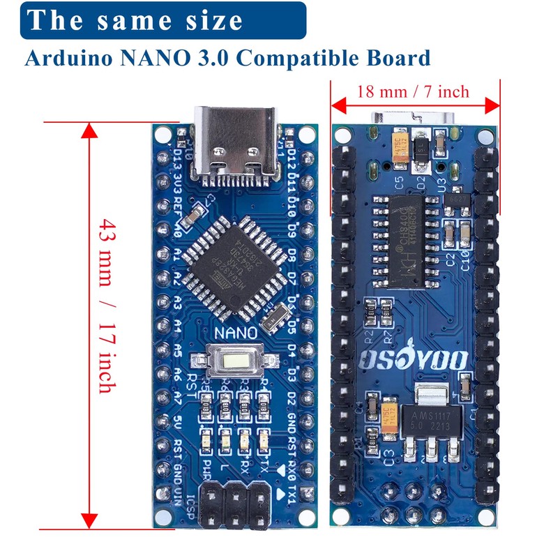 - The OSOYOO Nano Using Atmel At+mega+328P-AU as MCU, Support ISP download; Support USB-C download and Power.Compatible with Arduino Nano V3.0 fully compatible with Windows, Mac and Linux operating system.