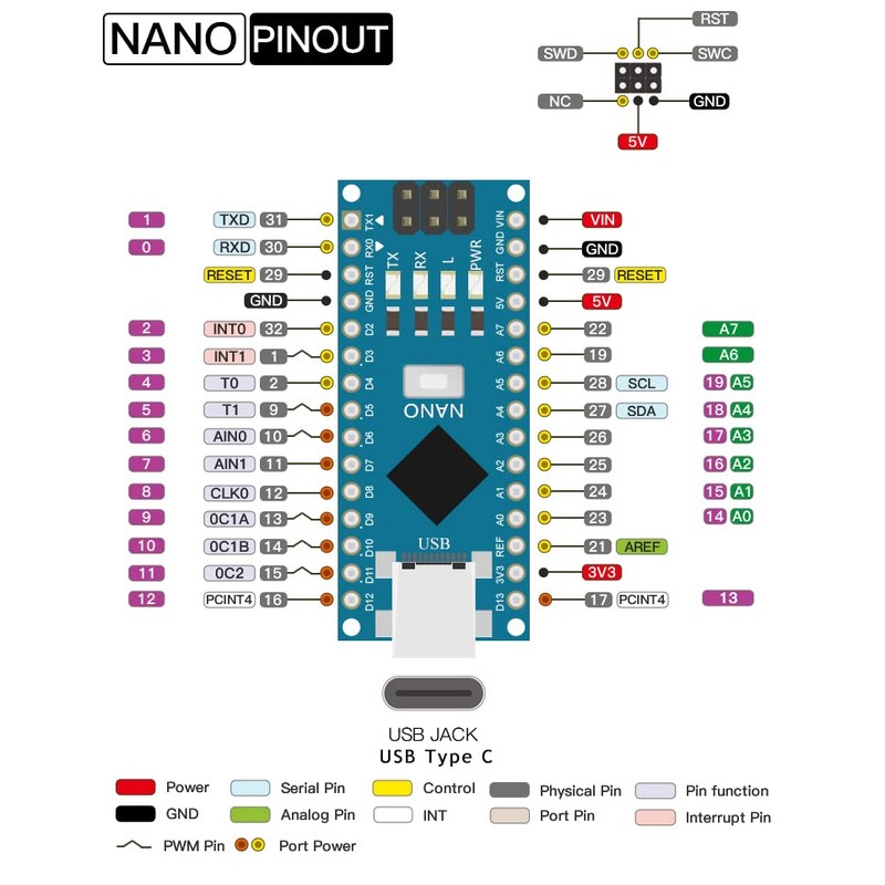 - OSOYOO Nano has 14 digital I/O pins (6 of which can be used as PWM outputs), 6 analog inputs, a 16 MHz crystal oscillator, a power USB-C jack, an ICSP port and a reset button.