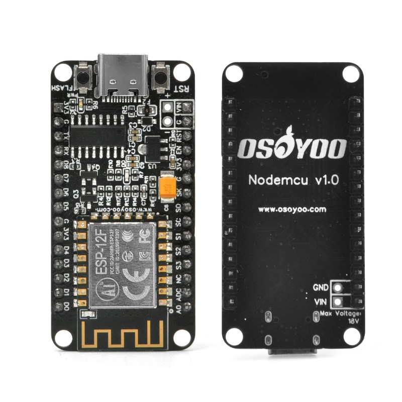The "OSOYOO NodeMCU Development Board" is based on ESP8266 and features WiFi connection, onboard USB to UART converter, and keys. It can also connect all pins of the "ESP-12F module" through the expansion header, connect to other peripherals to generate PWM, I2C, SPI, and UART serial communications.