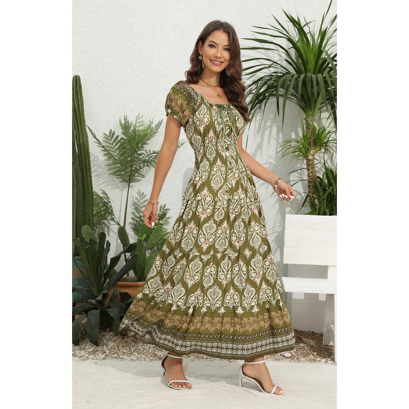 OSTOO Women's 2025 Summer Short Sleeves Boho Floral Print Tiered Casual Flowy Long Maxi Dress(Green,L)