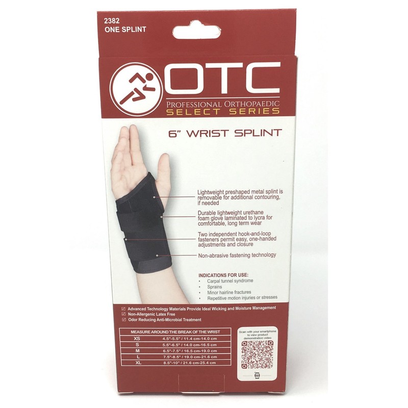 OTC brand (model 2382) select series wrist splint. Six-inch length for petite youth size hands. Provides excellent for treatment of mild to moderate wrist sprains and strains, carpal tunnel syndrome, minor hairline fractures, or following cast removal. Two separate hook and pile cinch fasteners permit easy, one-handed adjustments and closure. Preshaped metal splint wrist flexion is removable for additional contouring. Low profile contour at the palmar crease to allow for full finger dexterity. Lightweight laminated foam glove provides support and compression to the wrist and helps relieve swelling and minimize pain. Prevents painful movement and holds the wrist in a neutral position to promote healing. Perfect for latex sensitive wearers. Available for the left hand (model 2382/L) or right hand (2382/R).