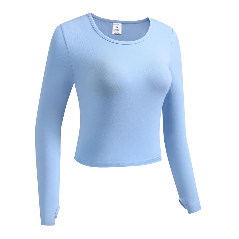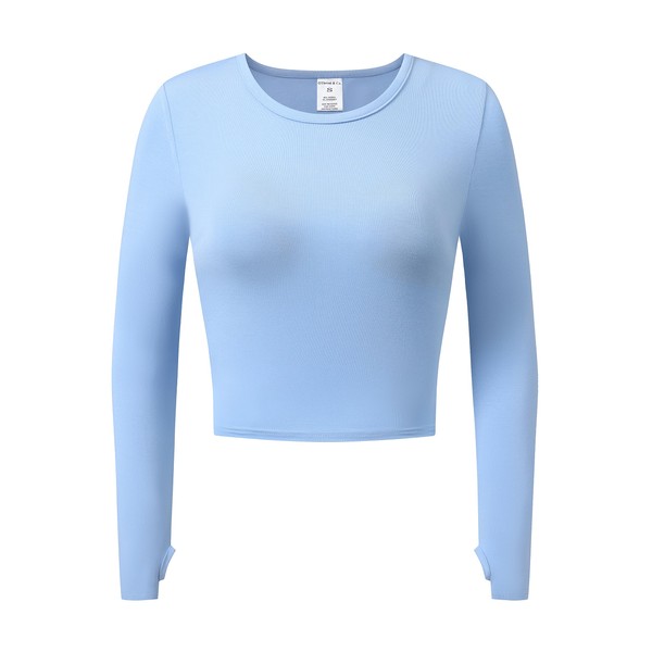 OThread & Co. Women's Long Sleeve Crop Top Comfy Thumb Hole Shirts Basic Stretch Layer (Large, Light Denim Blue)