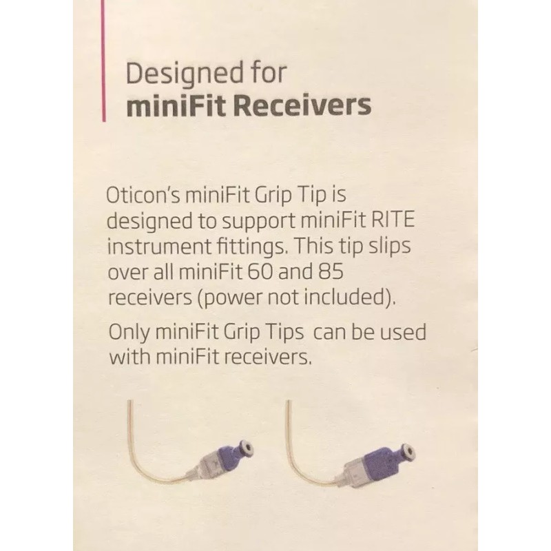 Oticon’s Grip Tip is designed to support miniFit RITE instrument fittings. These tips slip over all Oticon Standard (60dB) and Medium (85dB) receivers (power not included). MiniFit grip tips have a slightly tacky feel to help prevent slippage. For maximum performance and comfort, Grip Tips should be changed every 6 weeks. One pack of 4 grips tips is approximately a 6 month supply.