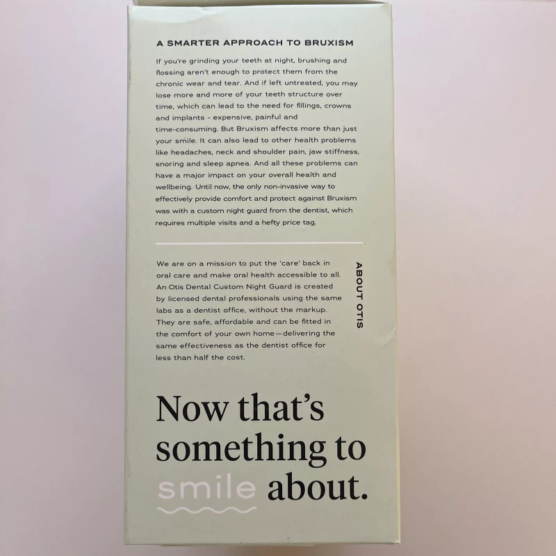 *Otis Custom Night Guards are a single-piece dental appliance (not a pair), usually made to sit on the upper teeth.