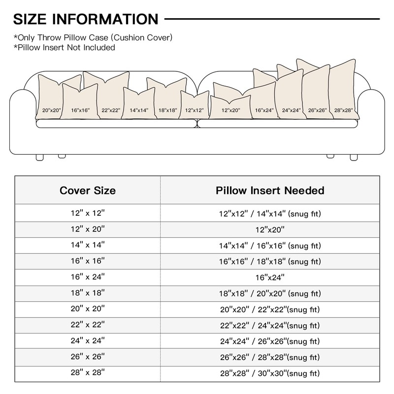 - Pillow cover size : 16” x 16” suitable for pillow size: 16” x 16” or 18” x 18” (snug fit)