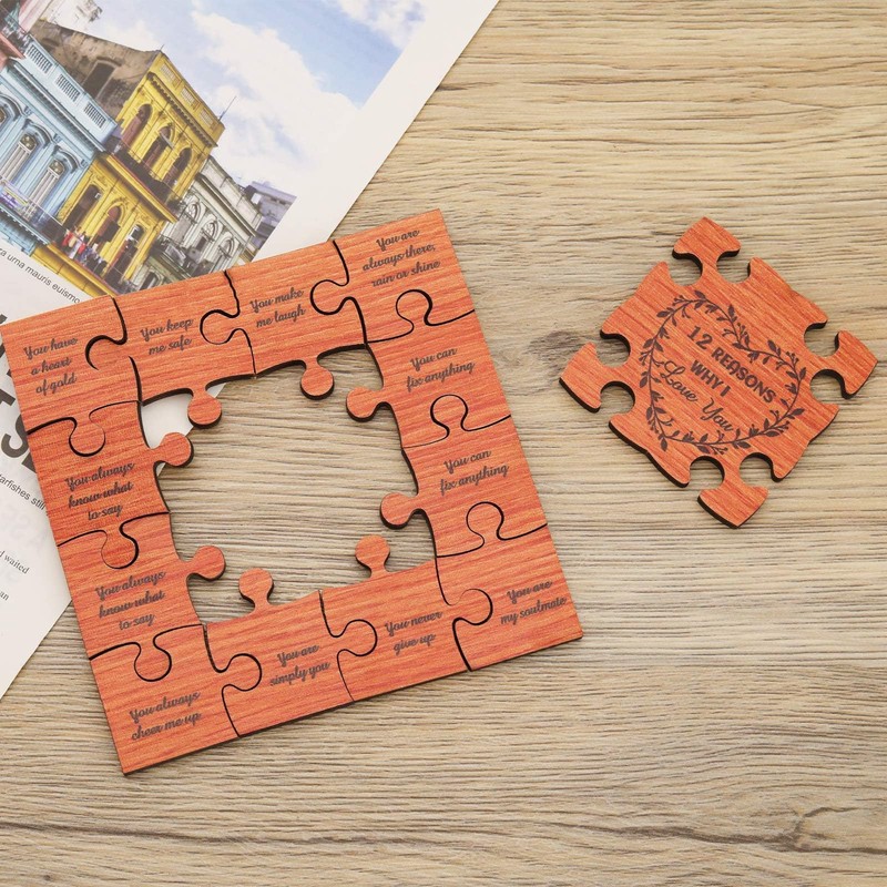 - [Meaningful Gift] - This beautiful gift includes 12 wooden puzzle pieces surrounding a big puzzle printed with "12 REASONS WHY I Love You" in elegant fonts.Express your love in a unique way.