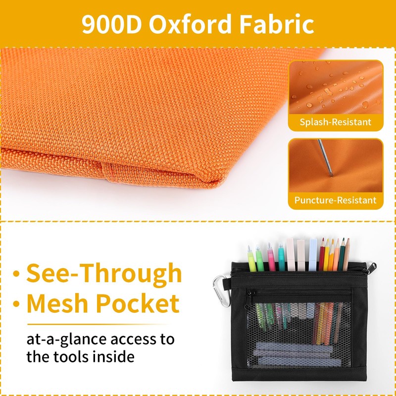 - BUILT TO LAST: The zipper tool pouch is made from 900D Oxford fabric, which is more textured than canvas. The fabric is strong, durable, hard wearing and wrinkle resistant, with good splash resistance that can keep out damp to help keep tools dry for better protection. Equipped with a heavy duty lining that prevents tools from puncturing the bag, also combined with strong stitching to withstand long term use