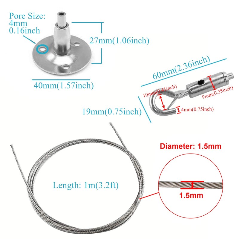 **Specifications:** \- Rope Material: iron \- Rope Diameter: 1.5cm \- Latch Hook Diameter: 1cm \- Length: 1m \- Weight: 42g / 1pcs \- Max load: 5 kg / 1pcs **Note** : For indoor use only. **Package includes: :** 10 x picture frame suspension wire rope