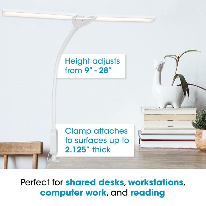 - Bring Wellness into Your Space: OttLite Pivot LED Clamp Lamp is perfect for shared desks, workstations, computer work, or reading. The flexible 18.875-inch neck lets you position light where you need it and holds position, extending the height from 9 to 28 inches. The sturdy clamp attaches to surfaces up to 2.125 inches thick. Amazon exclusive.