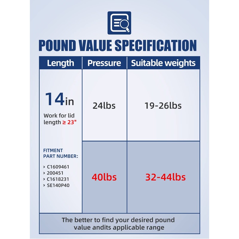 - 【Parameter】Extended length: 13.9 inch, compressed length: 8.5 inch; Force: 178N/40Lbs per strut, 256N/80Lbs per set, OEM: C16-09461, C1609461. [The range of force that one gas struts can bear is: 32-44 lbs, if it exceeds this range, please do not buy it !!!]