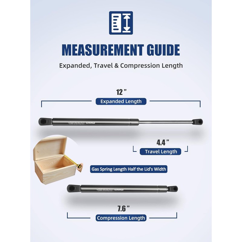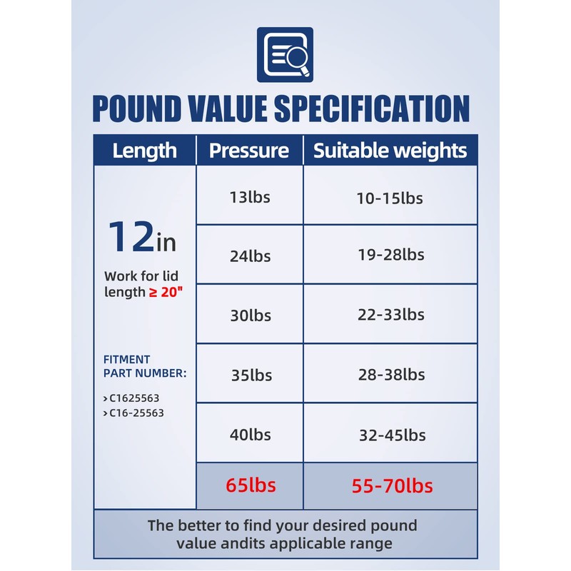 - Parameter: Extended length: 12 inch, compressed length: 7.6 inch; Stroke Length: 4.4 inch; Force: 289N/65Lbs per strut, 578N/130Lbs per set, OEM: C1625563