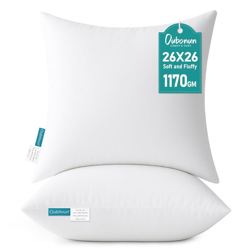 - Pillow Inserts: A pack of two 26x26 inch euro pillows, made from 100% polyester and shipped vacuum-sealed. Note: Inserts may appear flat upon opening—place them in the dryer on a low-heat setting to help them quickly regain full volume. For a fuller look, consider sizing up