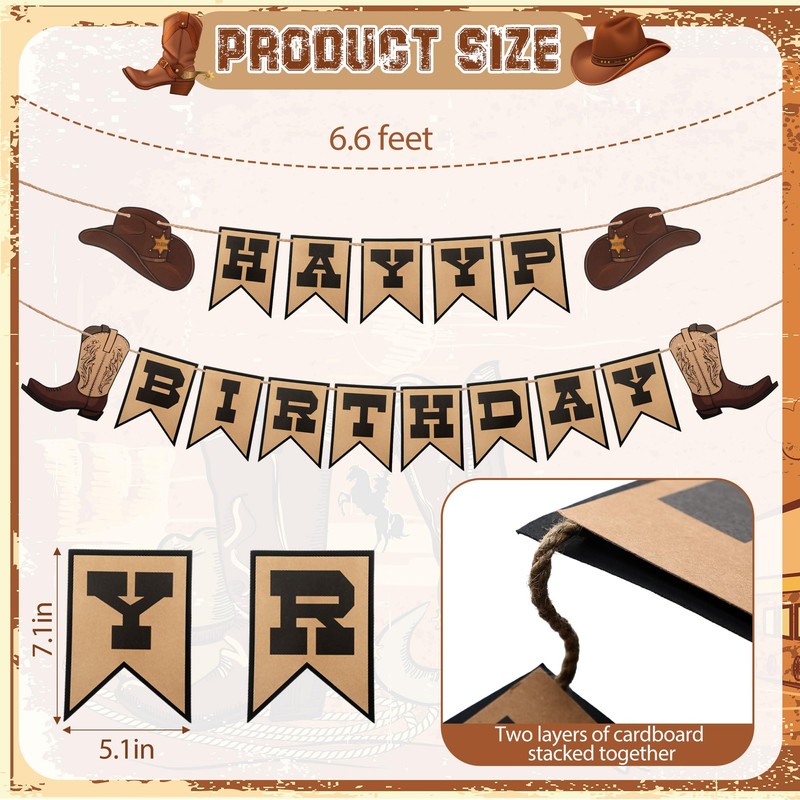 - Package Includes: the Cowboy Happy Birthday Banner is crafted from reusable cardstock; It consists of 17 card pieces and two 6.6 ft long ribbons, with each card piece approximately 7.1 ×5.1 inches in size