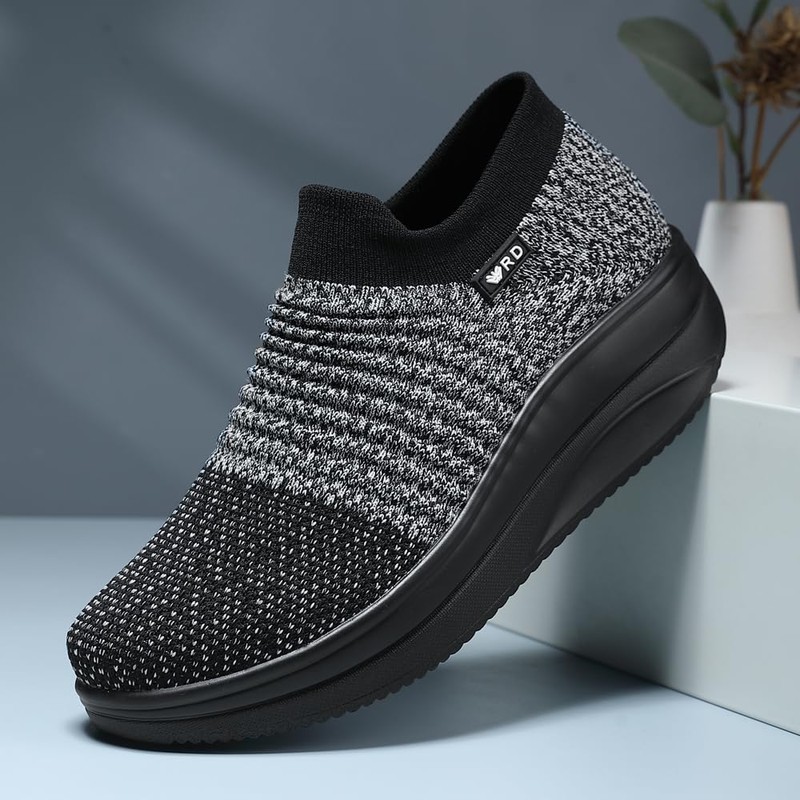 Oude Pull On Ladies Walking Sneakers On Cloud | Black Platform Shoes for Women Work Everyday | 2 Inch Rocker Bottom with Arch Support Size 9.5