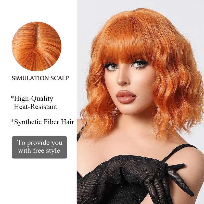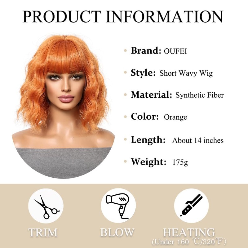 OUFEI Long Orange Wig With Bangs Natural Wavy Wigs for Women Natural Synthetic Hair Heat Resistant Wigs for Daily Party Cosplay Wear