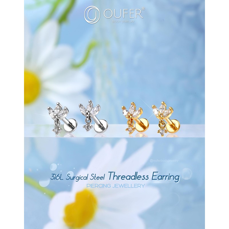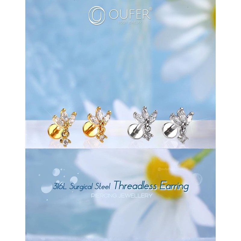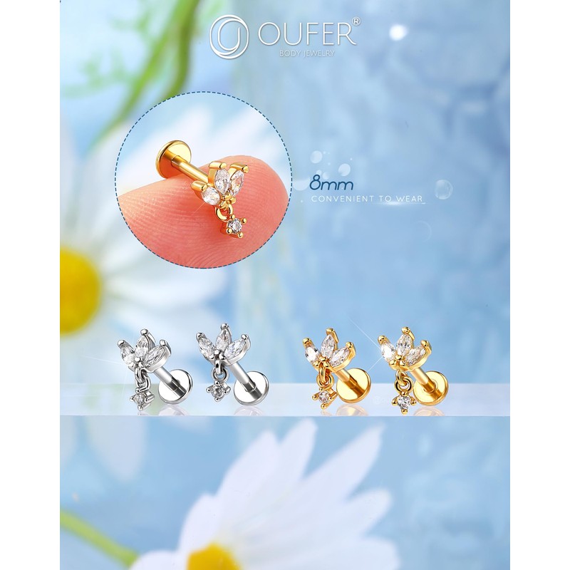 OUFER 16G Dangle Threadless Earring Surgical Steel 316L Cartilage Ear Piercing 6/8 mm Helix Piercing Clear CZ Conch Piercing Jewellery for Women Tragus Piercing, Stainless Steel, Cubic Zirconia