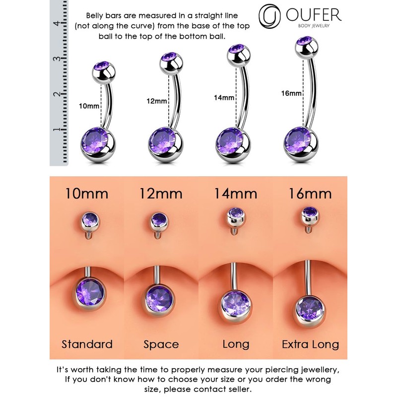 - Gauge of belly bars: the bar thickness is 14G/1.6mm, bar length has for sizes for you to choose (10mm/12mm/14mm/16mm), please choose the suitable size for your belly piercing, small ball size is 5mm and the big ball size is 8mm