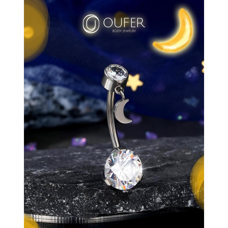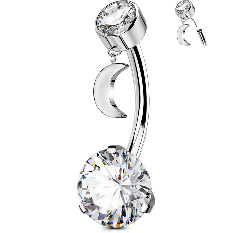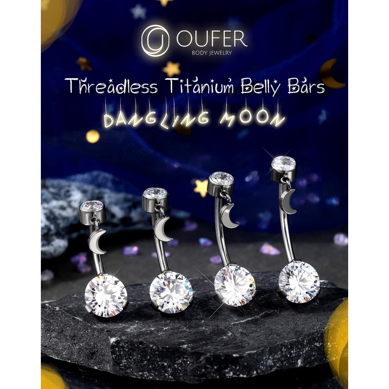 - Design of push in titanium belly button bars: threadless/push in design make the navel piercing jewllery more easy to take on or take off, clear CZ and moon dangle make the belly piercing more beautiful