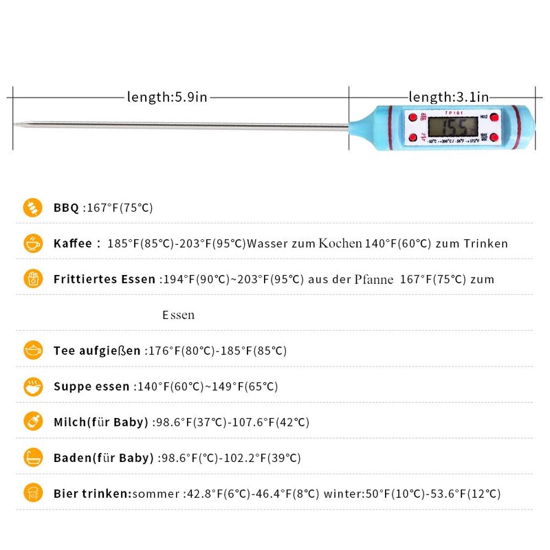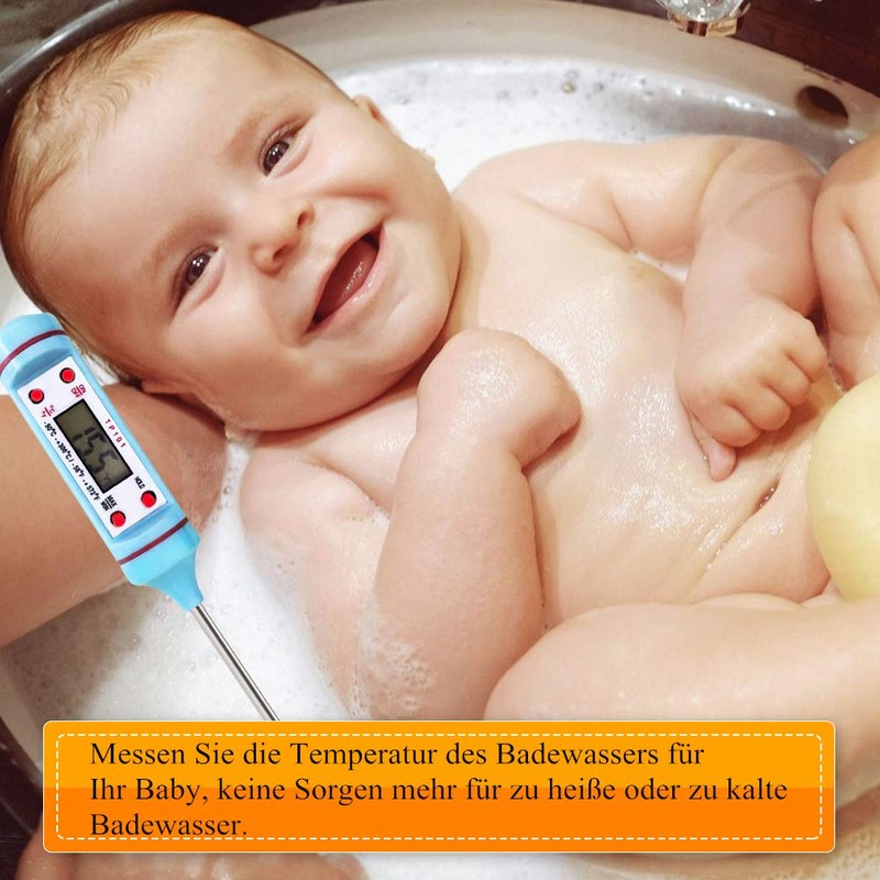 - Temperature measuring range: setting in degrees C ° or Fahrenheit °F possible. Wide measuring range from 50°C to 300°C, -58 to 572°F, the universal household thermometer is well suited for preparing baby food, cooking or meat grilling, sweets, milk, water, the core temperature of bread or roasting, etc.