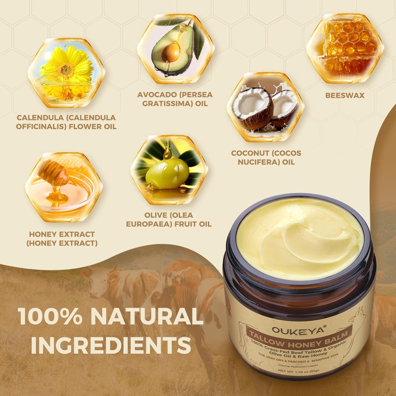 OUKEYA Beef Tallow Skin Care, Beef Tallow Face Cream, Tallow and Honey Balm, Deeply Nourishing for Face & Body (Enhanced Moisturising Version, 50g)