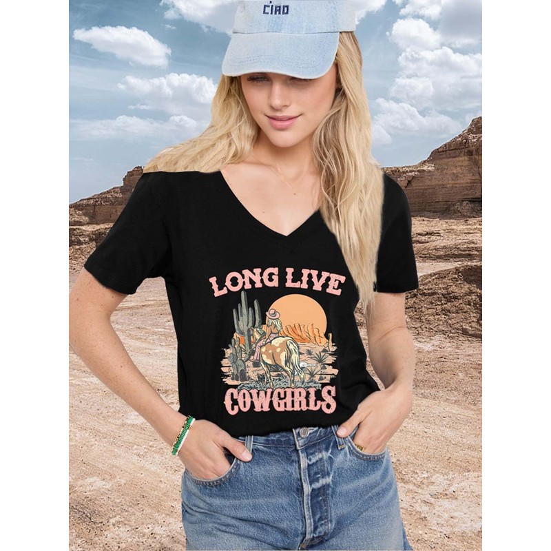 - Long Live Cowgirl Shirts Design: Women's V-neck shirt features a Western denim themed print design, featuring exquisite patterns such as saddles, lassos, deserts, and cacti, vividly reproducing the unique charm of the Western desert. Give it a try and you will definitely love it