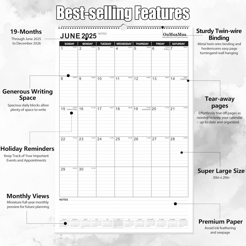 OuMuaMua Extra Large Wall Calendar 2025, 30" X 20" Vertical Jumbo Wall Calendar 2025-2026,19-Month Hanging Planner Wall From 2025 Jun - 2026 Dec with Spiral Bound For School Home Office Organizing