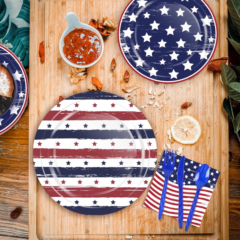 - Complete Set for Patriotic Parties:This 4th of July patriotic tableware set includes 9" and 7" paper plates (25 each), 25 napkins, 25 paper cups, 75 plastic utensils (knives, forks, spoons), and a flag banner with 8 cutouts and 1 string. Everything you need for a fun and effortless Independence Day theme party or any patriotic party supplies setup