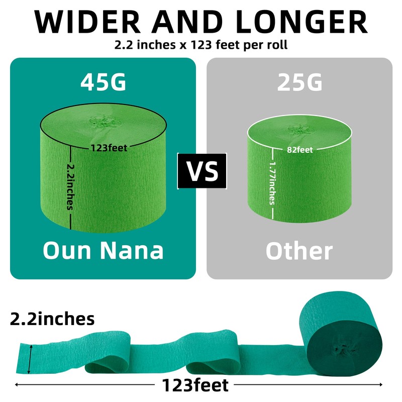 - Wider and Longer Per Roll: In order to meet the needs of more party scene decorations, we have produced wider and longer crepe paper streamers. The width of each roll is 2.2 inches and the length is 123 feet. There are 6 rolls in the package, which are enough for one party decoration