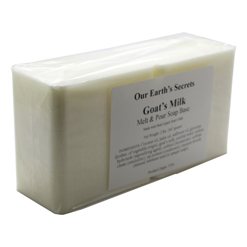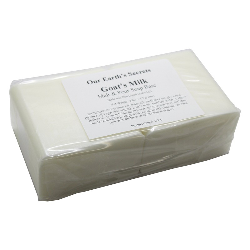 Our Earth's Secrets Goat's Milk Melt and Pour Soap Base is made in the United States with natural ingredients. Our Goat's Milk soap is made with real liquid goat's milk and has a delicate creamy later with a "custard" color.Ingredients: Coconut Oil, Palm Oil, Safflower Oil, Glycerine (kosher, of vegetable origin), Goat's Milk, Purified Water, Sodium Hydroxide (saponifying agent), Sorbitol (moisturizer), Sorbitan oleate (emulsifer), Oat protein (conditioner), Titanium Dioxide (mineral whitener used in opaque soaps), Oatmeal SoapNet Weight: 2 Lbs (907 grams)Our Earth's Secrets brand