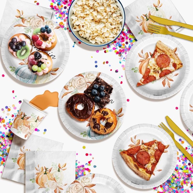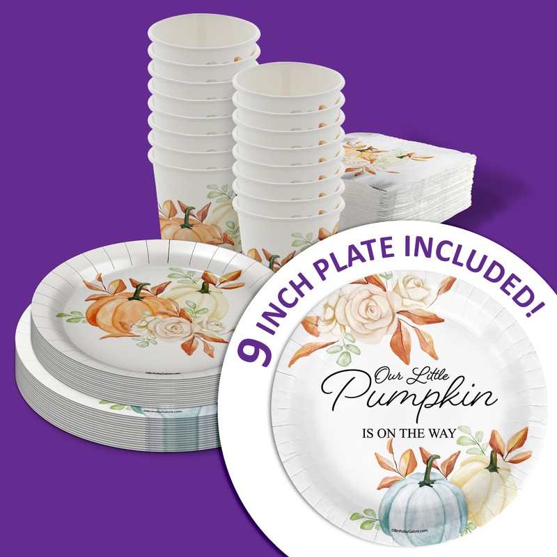 Our Little Pumpkin Is On The Way Boy Baby Shower Party Supplies - 64 Piece Fall Baby Shower Tableware Set Includes Large 9" Dinner Plates and 8" Dessert Paper Plates Napkins Cups - Kit for 16