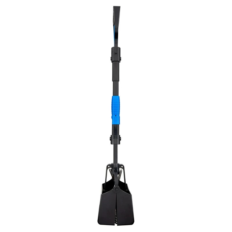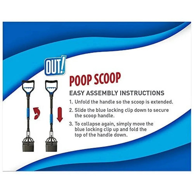 OUT! One-Handed Poop Scoop makes picking up after your pet in the backyard simple and painless. The One-Handed pooper scooper uses a spring-action scooper with an easy-squeeze handle that makes picking up dog poop and pet waste a snap, helping to eliminate bending and stooping. Poop Scoop unfolds to extend to 27 in and collapse back down for easy storage, and can hold waste from large breed dogs and small breed dogs. Works great on all surfaces, including grass and gravel. Directions for use: Unfold the handle so the scoop is extended. Slide the blue locking clip down to secure the scoop handle. To collapse again, simply move the blue locking clip u paned fold the top of the handle down.