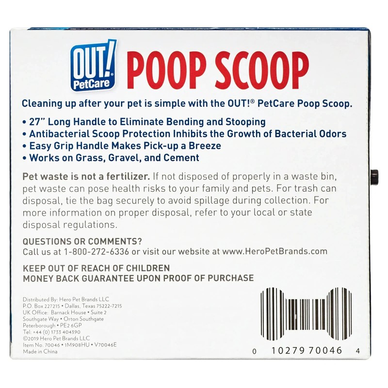 - OUT! One-Handed Poop Scoop makes picking up after your dog or pet in the backyard simple and painless