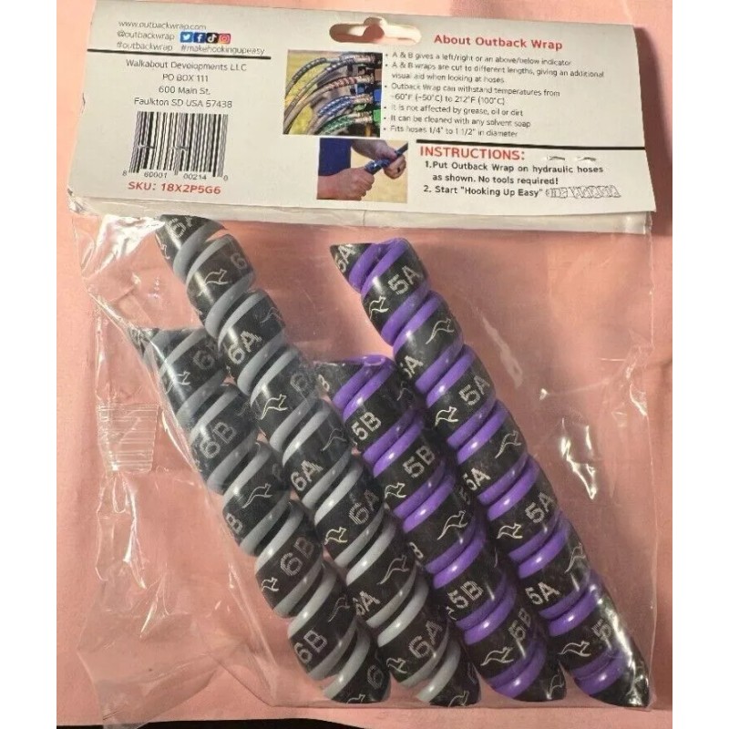 This package contains (4) Outback Wrap Hydraulic Hose Markers (or hydraulic hose tags), for remotes 5 and 6 (gray and purple). The wraps will fit 1/4" to 1-1/2" hoses.