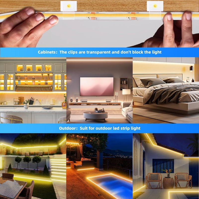 - Transparent Design: The clip has a clear design that does not cover the light from the light strip and easy to hide (especially for COB). Clips are suitable for widths of 8-10 mm and heights for 4 mm light strip such as COB, 5050, 2835, 3535,etc