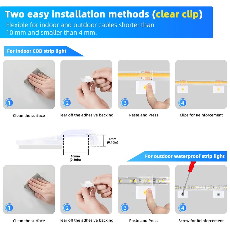 - Waterproof Outdoor Installation: The clips is very durable and waterproof for outdoor use. Clean the surface (if adhesive backing is required), put the strip in and tighten the screws