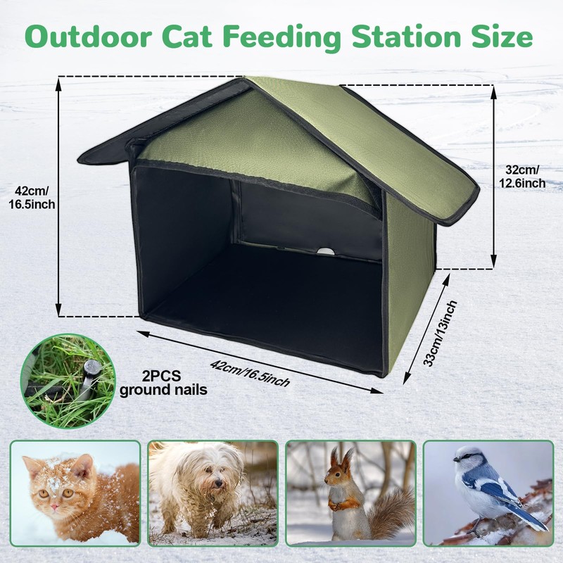 - Secure & Windproof Stability - Outdoor cat feeding station includes ground stakes + anchor straps to keep the station firmly in place, preventing tipping or blowing away in strong winds