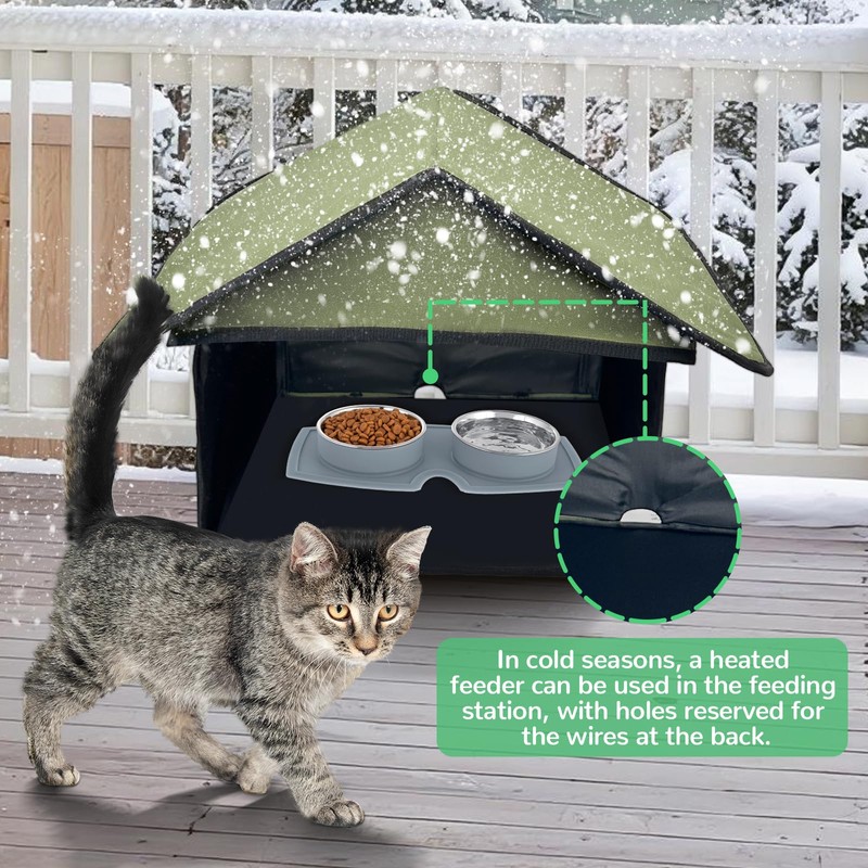 - Heated Feeder Compatible - Outdoor cat house features a rear cord access hole for easy power cord routing, allowing seamless use with heated bowls or warming pads (sold separately) for winter feeding