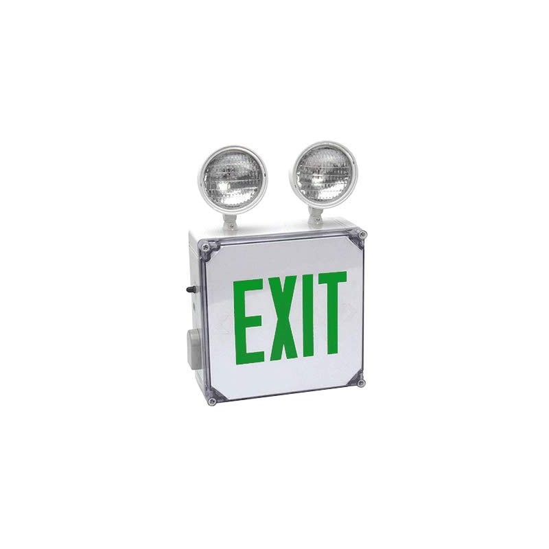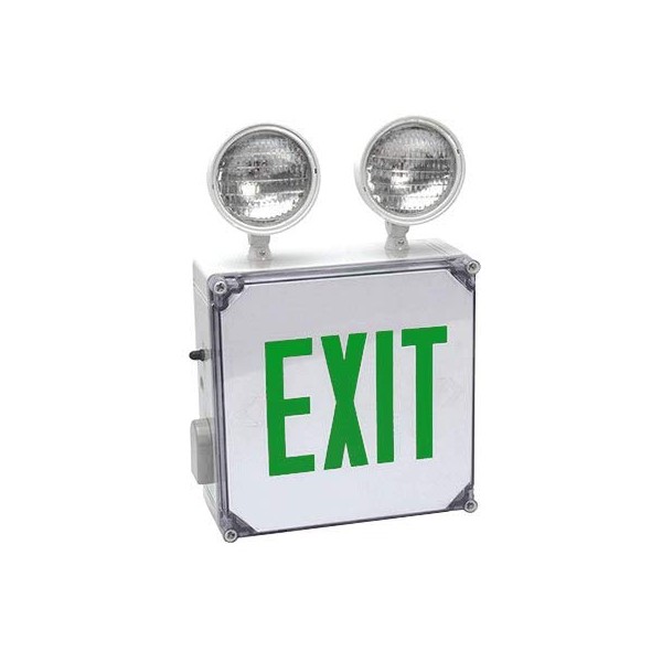 This Outdoor Exit Sign & Emergency Light Combo with Green Letters includes
