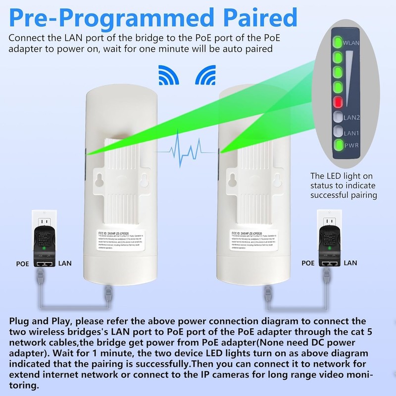 [⚡24V PoE Injector]: The PoE injector included with the Point to Point Wireless Bridge simplifies installation by combining power and data transmission over a single Ethernet cable. This streamlines setup procedures, reducing complexity and minimizing the need for additional power sources. With a 24V output, it ensures efficient power delivery to the wireless bridge, enhancing reliability and convenience during deployment. Its integrated design eliminates the necessity for separate power adapters, optimizing space utilization and contributing to a tidier installation process. This feature underscores the product's commitment to user-friendly operation and efficient connectivity solutions.