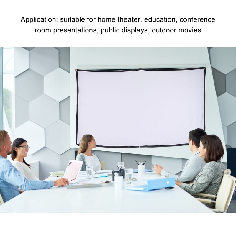 1、The screen adopts anti‑crease design, no longer annoyed by the wrinkles or creases caused by the folding of the screen, you can have a pleasant viewing experience 2、This projection screen has 6 hooks and holes around the screen, which is convenient for hanging and easy to use. You just need to hang it on the wall with a hook or rope 3、Having a compact one-piece shape and a lightweight folding design. You can fold the screen into a small size and put it in a backpack or suitcase, suitable for indoor and outdoor use 4、The projection screen has a smooth surface, which enhances the clarity of image display and the projection effect of 16:9 screen format for better visual enjoyment 5、Ideal for home theater, educational lectures, conference room presentations, public displays, outdoor movies, etc., whether it is used at home or in office, it will make you satisfied