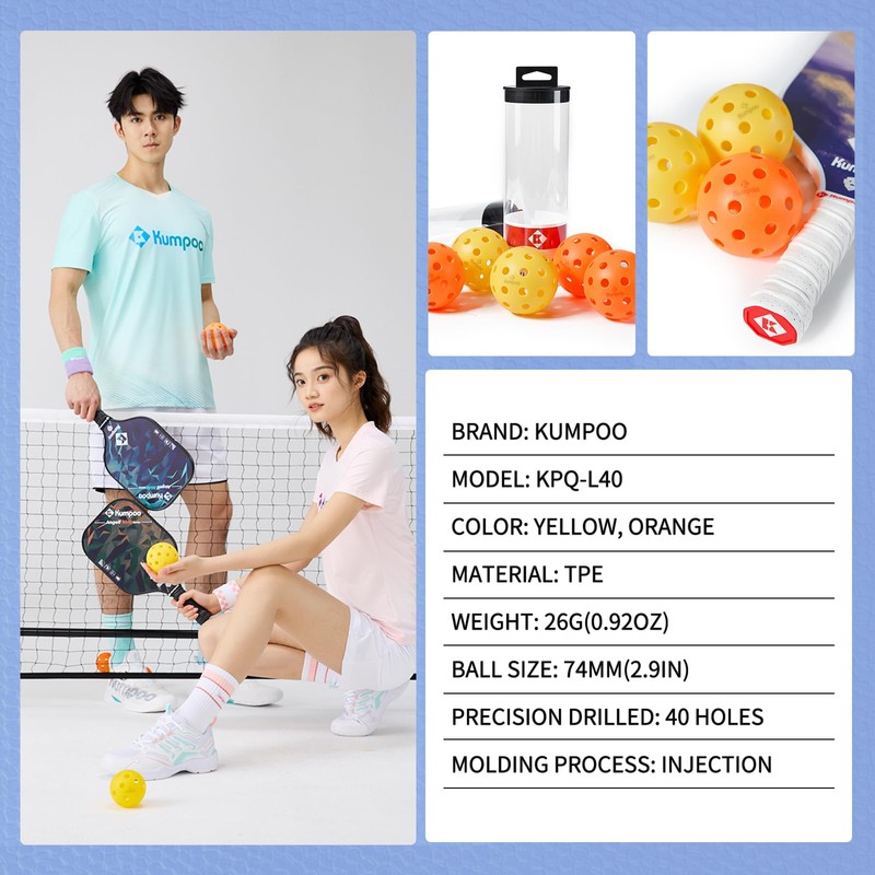- 【40 Holes Outdoor Pickleball Balls】Each Pickleball measuring 74mm(2.9inches) in diameter and weighing 26g(0.92oz). With 40 precision injection-molded and drilled holes, the kumpoo pickleballs minimizing air resistance for faster speeds and precise landing spots. Light orange.